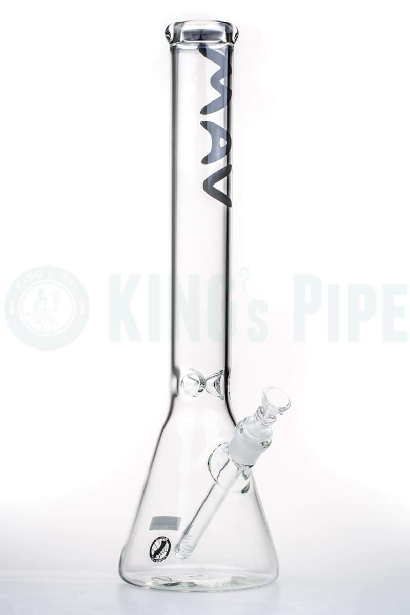 The Maverick Glass 18" Glass Beaker Water Pipe is a beefed up version of the usual beaker shaped, scientific glass beaker bongs, but boy is it fun to use! Donning an ice pinch in the neck, an 18mm Female joint and 14mm / 18mm diffused downstem & 14mm Male glass bowl, connecting to a big, beautiful, 5mm thick, Borosilicate glass body that was handcrafted right here in sunny Los Angeles. Ensuring your American glass water pipe won't shatter when exposed to extended periods of heat and will last you years of smoking pleasure. Looking for something a bit more discreet? KING's Pipe Online Smoke Shop carries a variety of tobacco glass beaker bongs to choose from, for some great sale prices too!