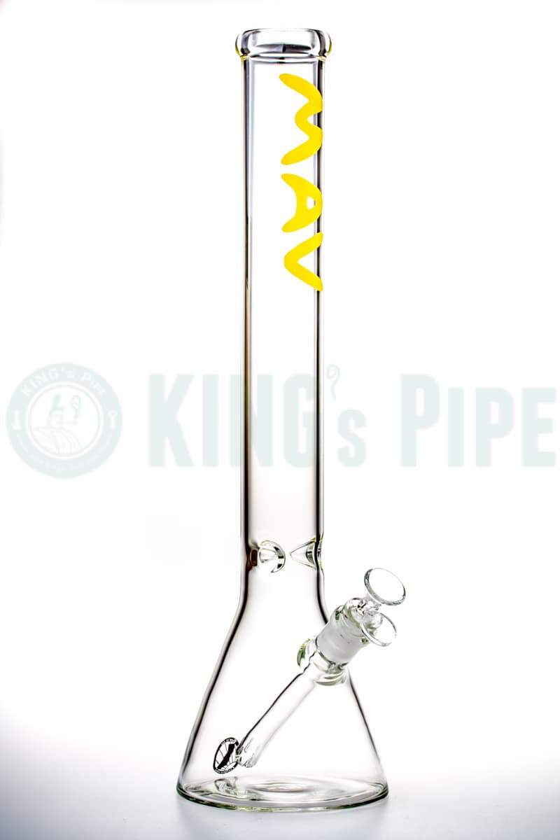 The Maverick Glass 18" Glass Beaker Water Pipe is a beefed up version of the usual beaker shaped, scientific glass beaker bongs, but boy is it fun to use! Donning an ice pinch in the neck, an 18mm Female joint and 14mm / 18mm diffused downstem & 14mm Male glass bowl, connecting to a big, beautiful, 5mm thick, Borosilicate glass body that was handcrafted right here in sunny Los Angeles. Ensuring your American glass water pipe won't shatter when exposed to extended periods of heat and will last you years of smoking pleasure. Looking for something a bit more discreet? KING's Pipe Online Smoke Shop carries a variety of tobacco glass beaker bongs to choose from, for some great sale prices too!