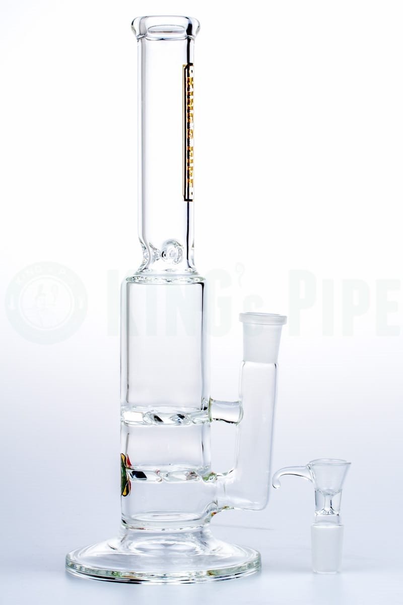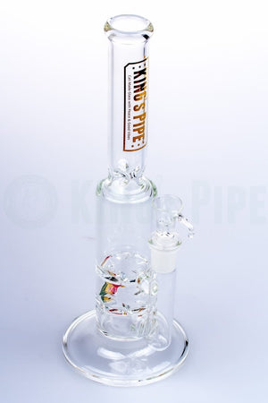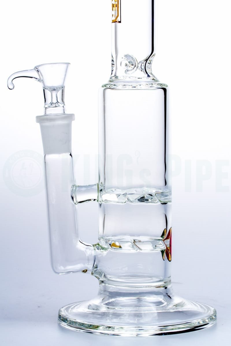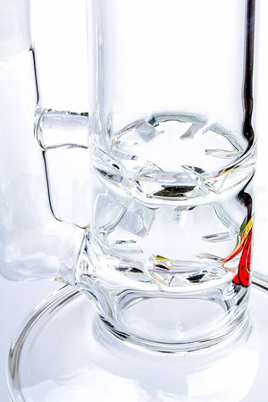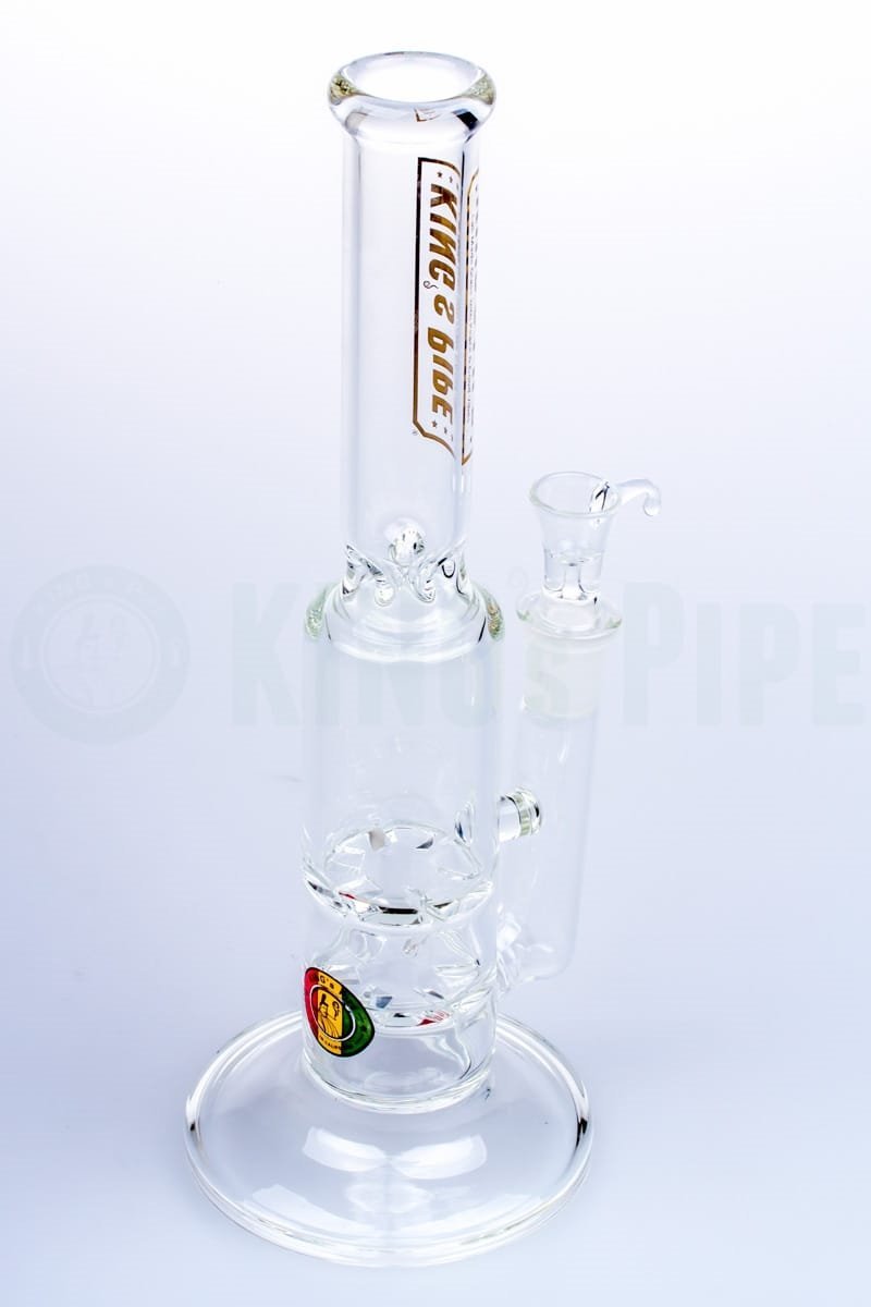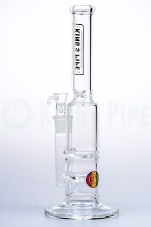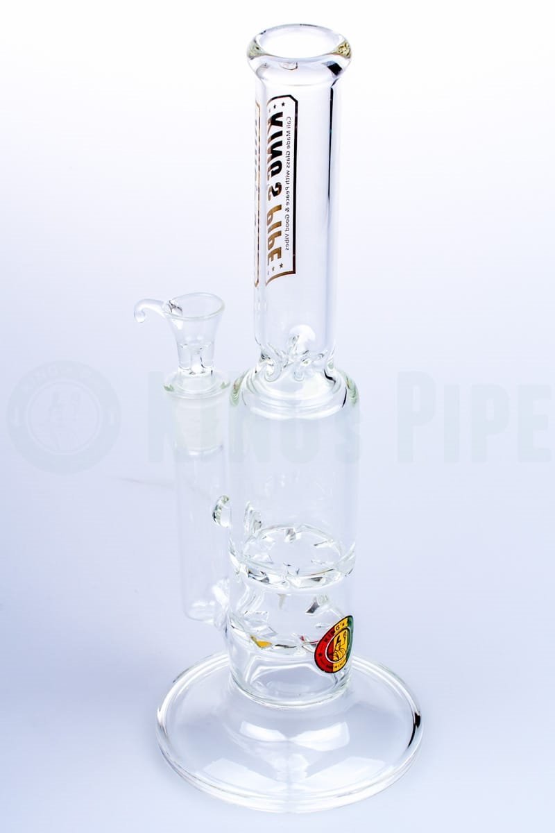 The 12" Double Tornado Water Pipe boats 2 cyclone turbine disc percolators with 8 slits each, by far one of the most extraordinary and in-demand styles of disc percs in the market today. This scientific glass, tobacco bong is hand-blown with sturdy 5mm thick, Borosilicate glass in beautiful Southern California. Guaranteeing this sleek glass water pipe won't just shatter when exposed to high heat levels and will last you many-a-smoking sessions. Also sporting a nifty ice catcher in its slender bottleneck to add some crushed, chilly goodness to your already filtrated rips. To make the tornado swirl effect, we suggest you rip hard and hit hard! Included are an 18mm Female joint & 18mm Male joint bowl or a banger nail. Take advantage of KING's Pipe Online Headshop's low sale price, today!
