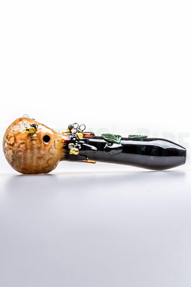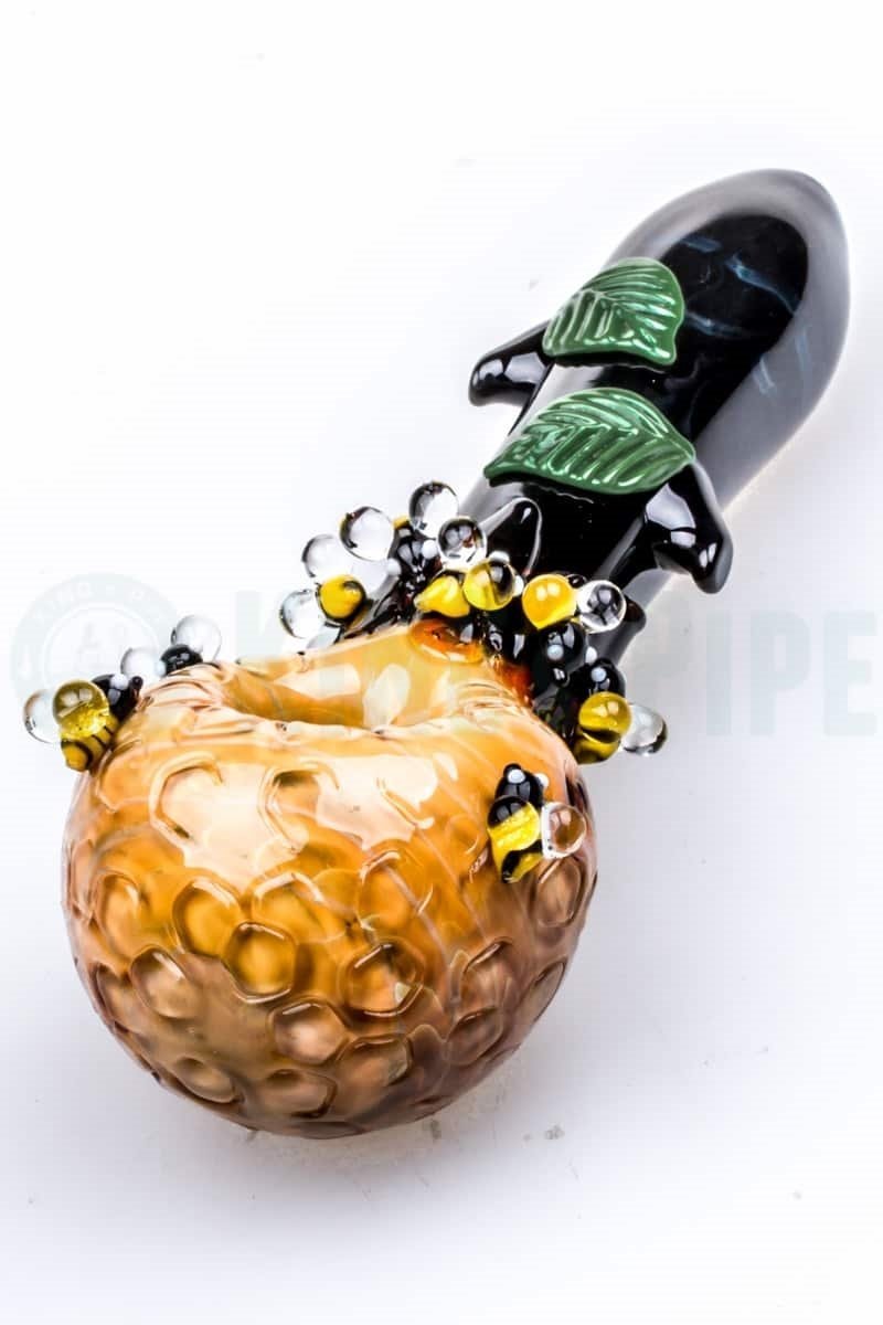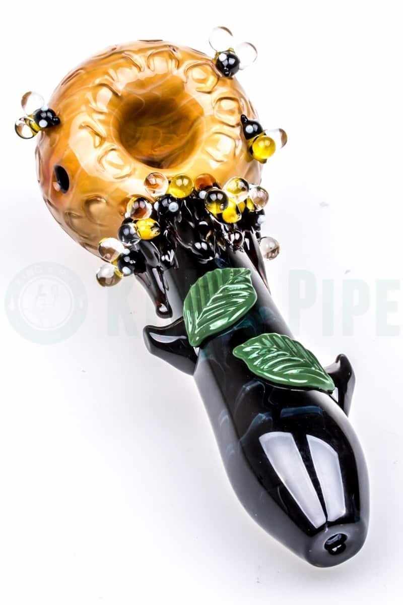 The Empire Glassworks 6 inch Honey Pot Glass Spoon Pipe looks like it could give Candyman a run for his money! Amazingly crafted with a dozen tiny, little honeybees on this American glass pipe's honey pot for a bowl, while embossed green leaves adorn its body. You can definitely say this unique glass spoon pipe is as durable as it is adorable! Expertly handcrafted in sunny Southern California, this thick glass pipe would be an amazing addition to anyone's collection.