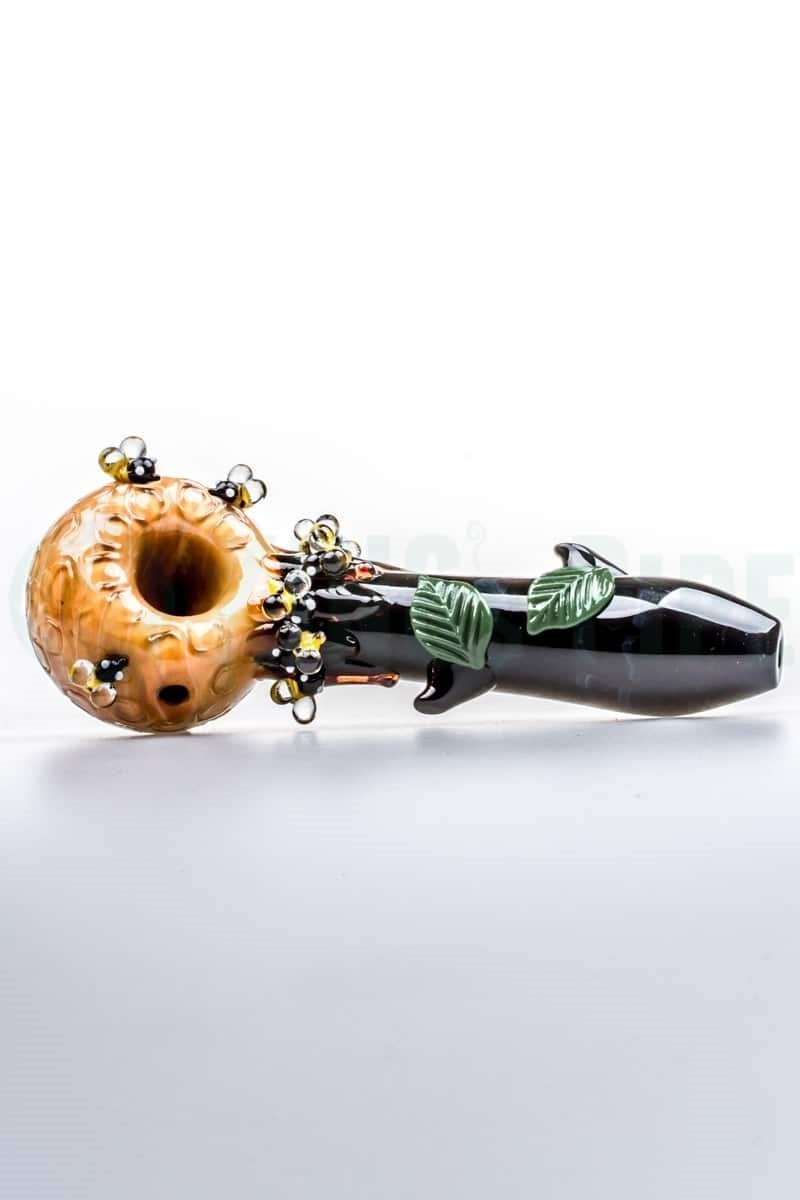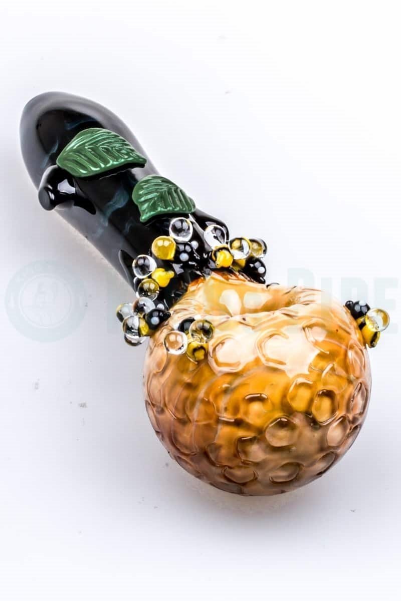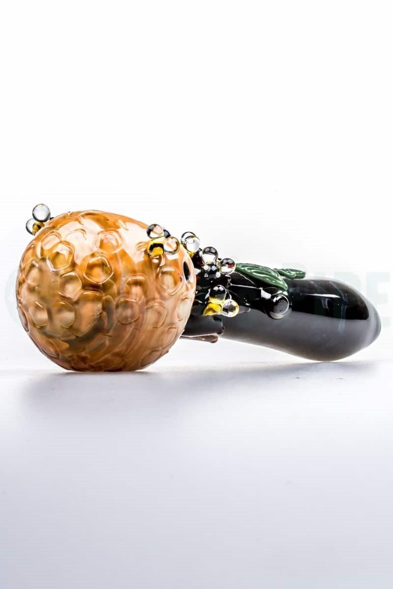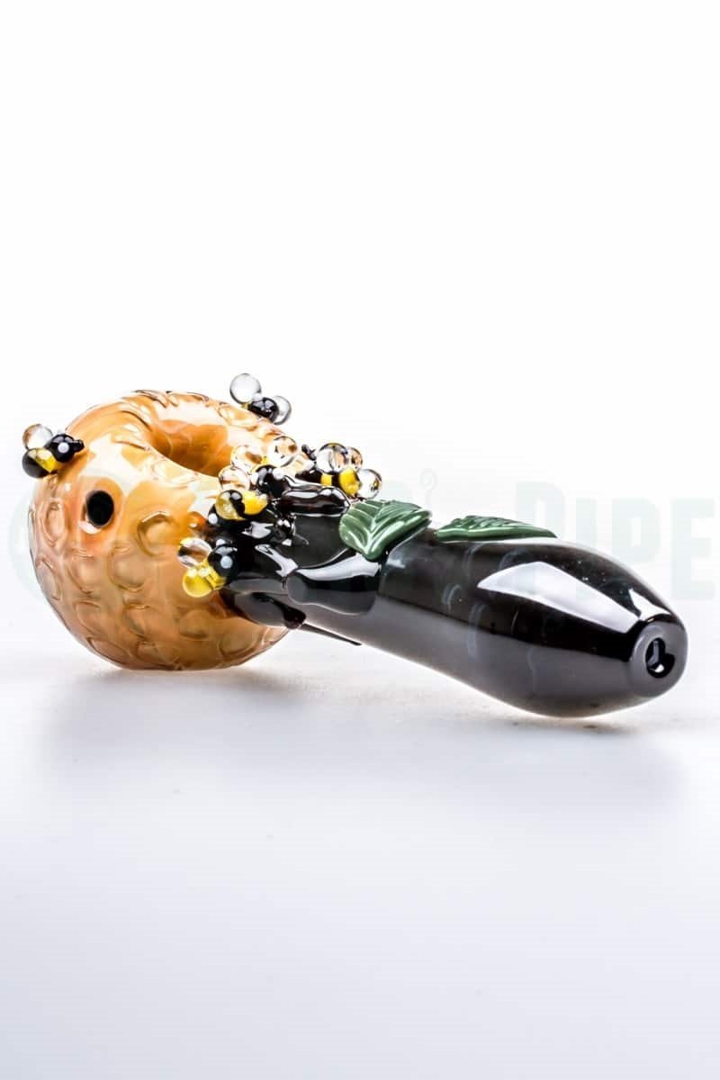 The Empire Glassworks 6 inch Honey Pot Glass Spoon Pipe looks like it could give Candyman a run for his money! Amazingly crafted with a dozen tiny, little honeybees on this American glass pipe's honey pot for a bowl, while embossed green leaves adorn its body. You can definitely say this unique glass spoon pipe is as durable as it is adorable! Expertly handcrafted in sunny Southern California, this thick glass pipe would be an amazing addition to anyone's collection.