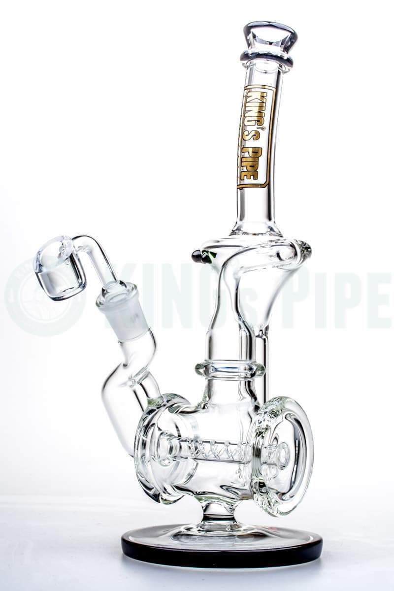 Double the excitement you'll get with the KING's Pipe - Double Cross Inline Slit Percolator. This glass recycler rig is radiating with peace and good vibes as it comes with a crystal clear glass with a slime green accent on its wide base and mouth tip. Handcrafted to perfection in all the right places using Premium-Quality Borosilicate Glass, this recycler is super durable and ensures you of long time use. This 10-inch recycler comes with a 14mm Female Joint that includes a 14mm Male Quartz Banger Nail. These fit together into this smoking glass piece and does great when it comes to holding a generous amount of your favorite material so that all you need to look forward to is a satisfying toking sesh. It also comes with a bent neck for that extra comfort as you take draws plus enjoy the best diffusion with its double inline slit percolator. Call your fellow tokers and get the ball rolling until you achieve those smooth and massive hits! Get the KING's Pipe Glass - Barrel Recycler Rig here at KING's Pipe for a price under $150 and make sure to check more of our sparkly KP Glass pieces!