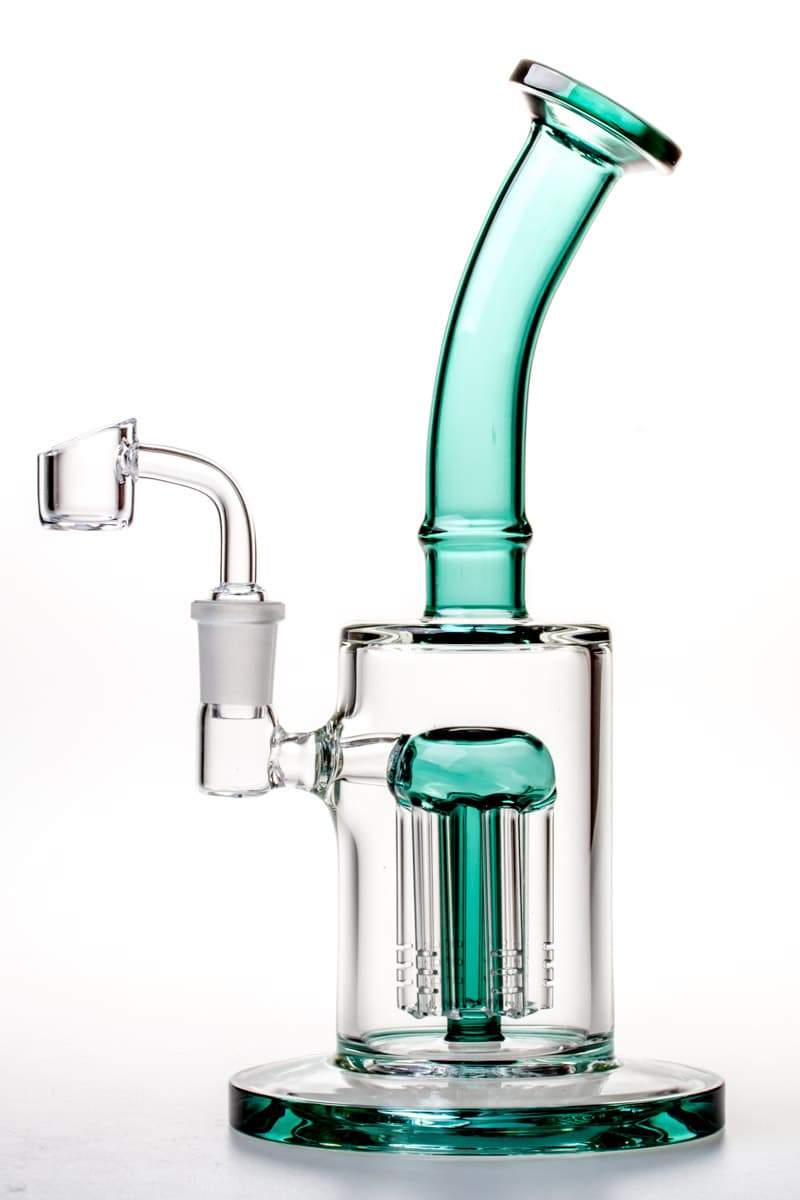 Introducing the 9 Inch Tree Perc Oil Dab Rig, featuring a 6-armed tree percolator for an ultra-smooth smoking experience. Standing at 9 inches tall with a bent neck, this rig has a 14mm female joint and comes with a 14mm male banger for convenient use. Add a pop of color with the color accent. Get lit with this sleek and functional dab rig!