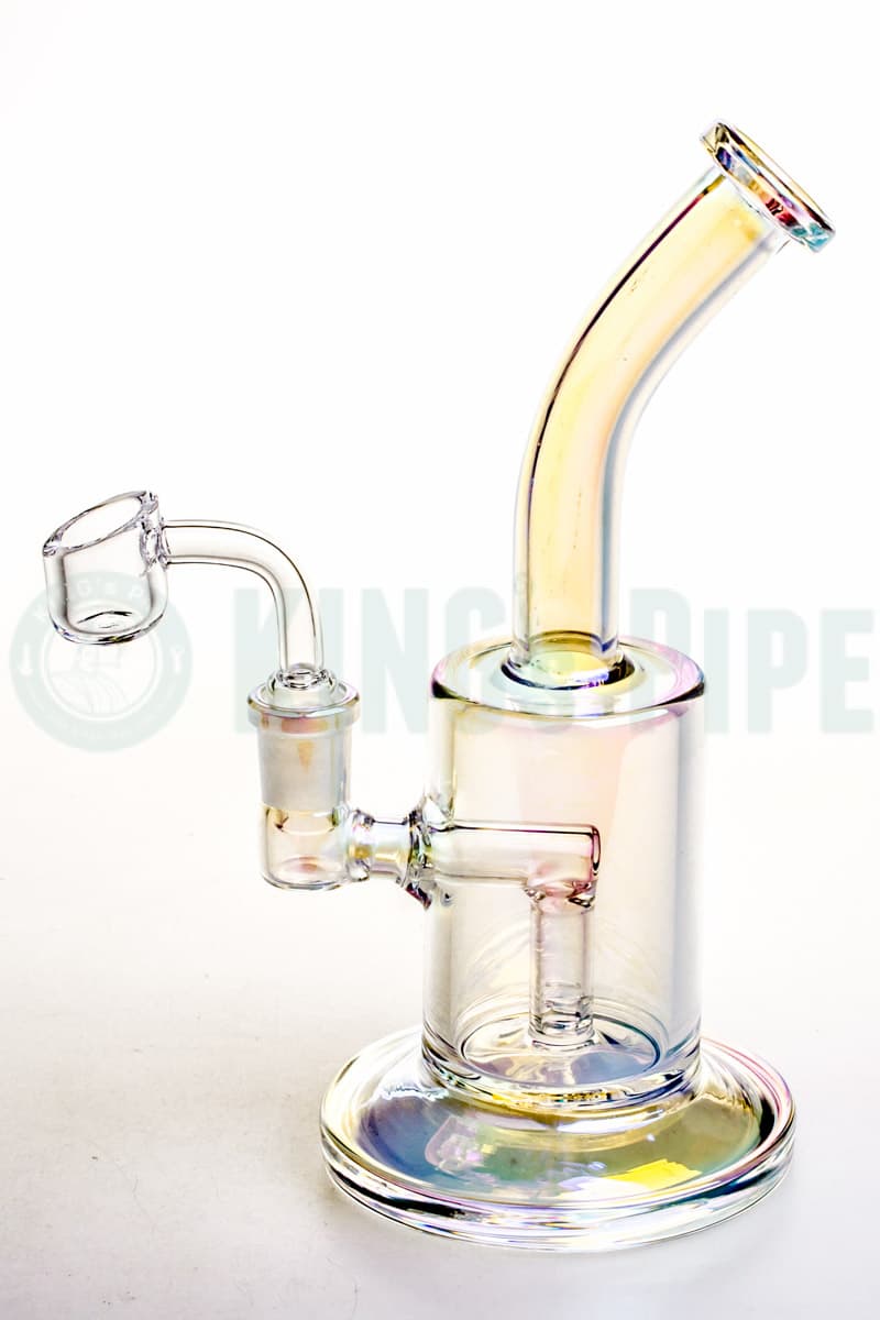 Do not be fooled by this compact 7.5" Iridescent Glass Dab Rig. it may be small in size but this adorable vapor rig performs like no other as it does a great job in keeping your concentrates tasty and filtrated. It features a bent neck and a shiny iridescent color that will put a pop of color in your glass collection. This portable dab rig is made from Borosilicate Glass with a 14mm female joint and comes with a 14mm male quartz banger nail. This scientific glass bong may be low in price but it is crafted to perfectly suit your taste!