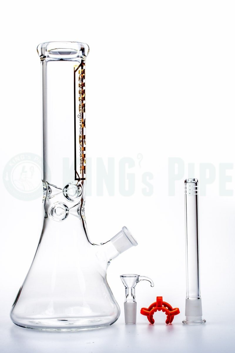 Our very own KING's Pipe Glass 12 inch Beaker Bong stands tall enough for you to get a nice fat rip. Featuring its 14mm/18mm Diffused Downstem that also comes with 14mm Male Glass Bowl, has an 18mm Female Joint and an Ice Pinch. Handcrafted by local Los Angeles based glassblowers using Premium-Quality Borosilicate Glass, this classic water pipe also includes a Keck Clip that prevents your bong pipe from disconnecting and keeps your smoke airtight. Let your smoke get the filtering it needs as it passes through a Diffused Downstem Perc letting you have that mind-blowing bong rip! Gold and rasta KING's Pipe decals add a subtle pop of life, all for just under $80!