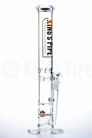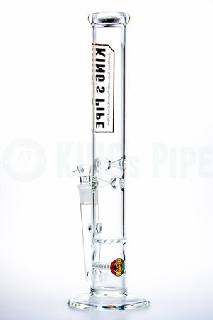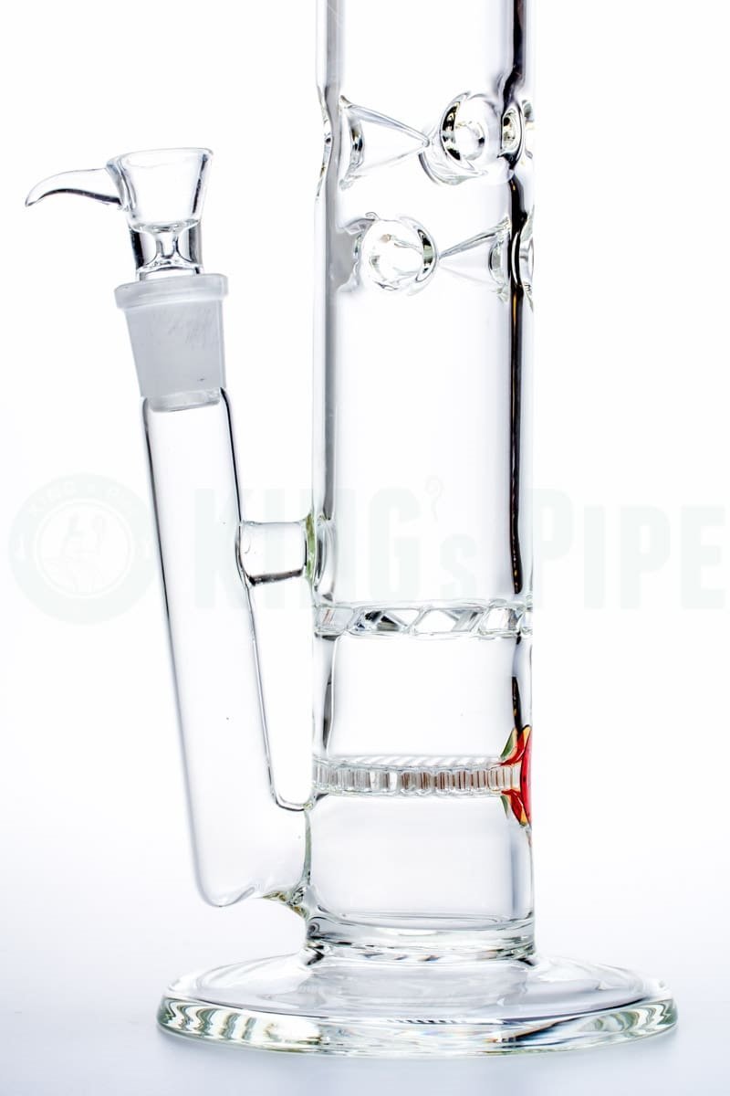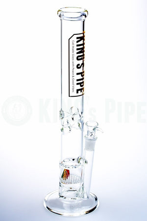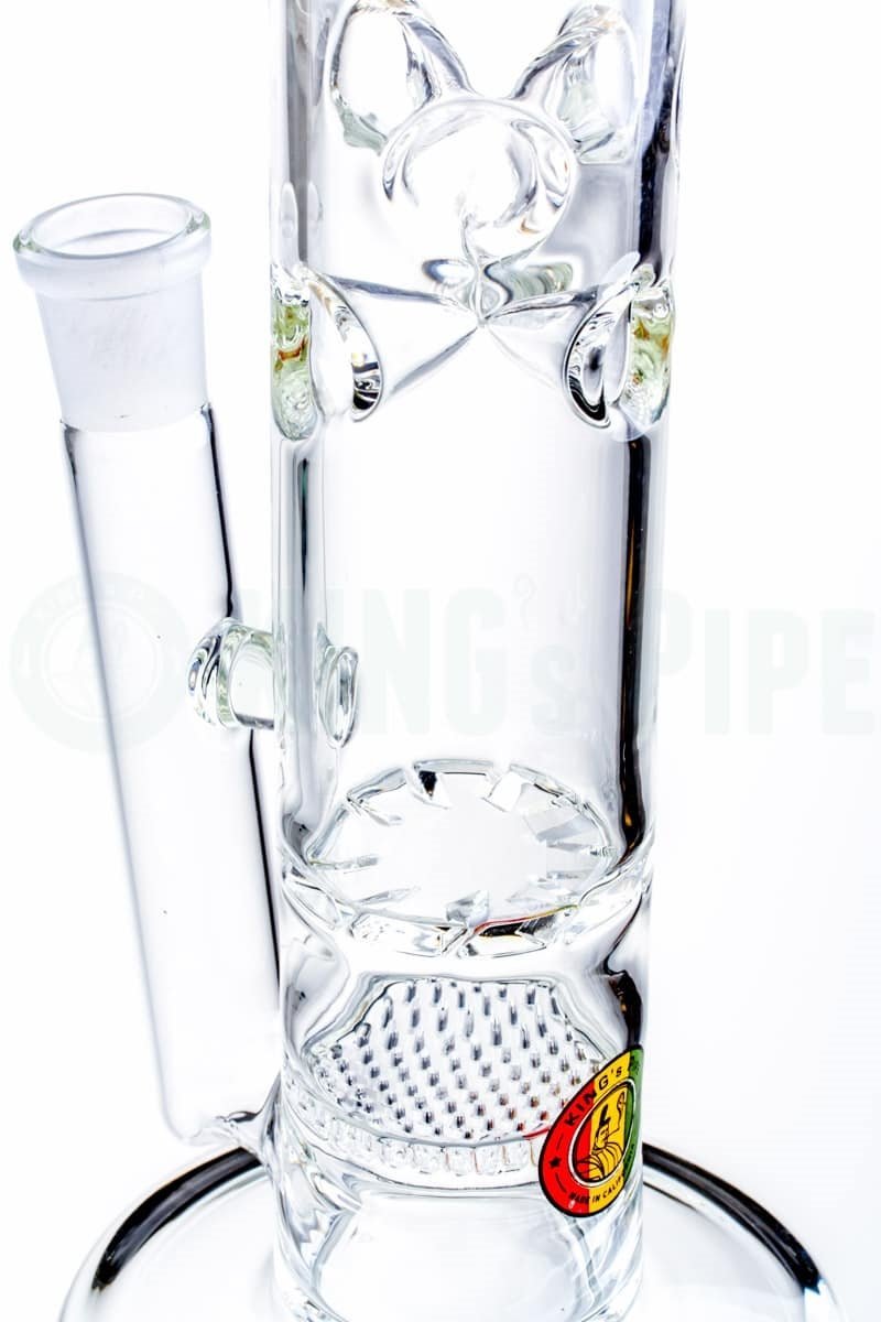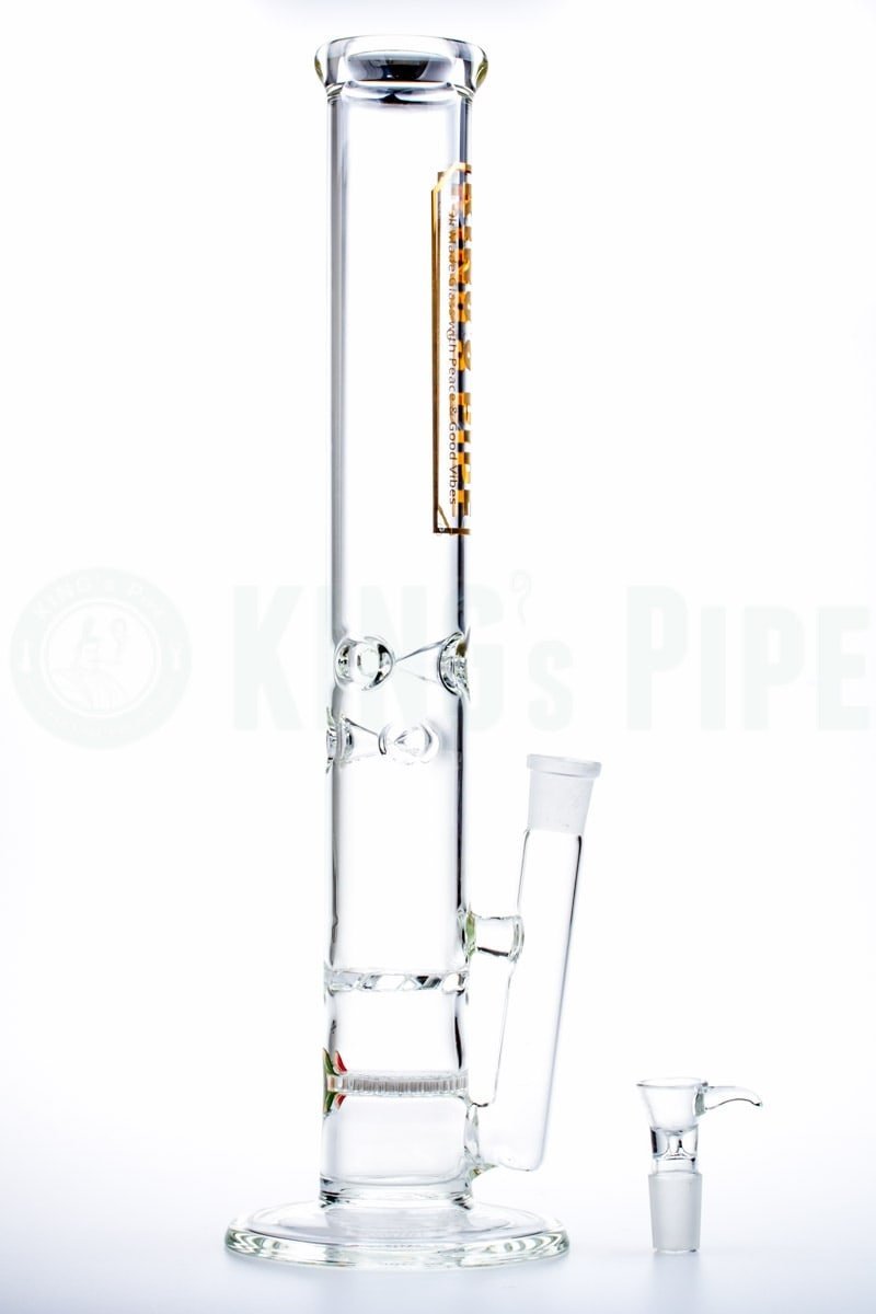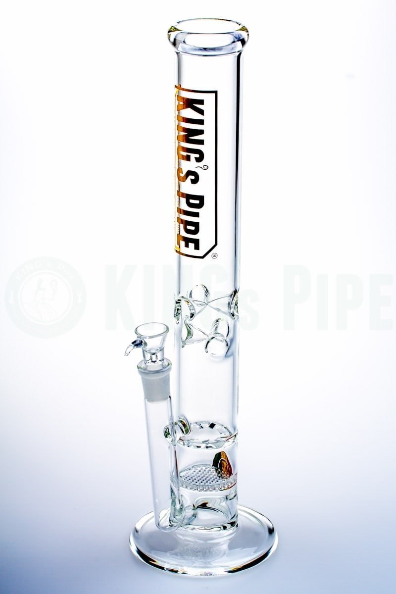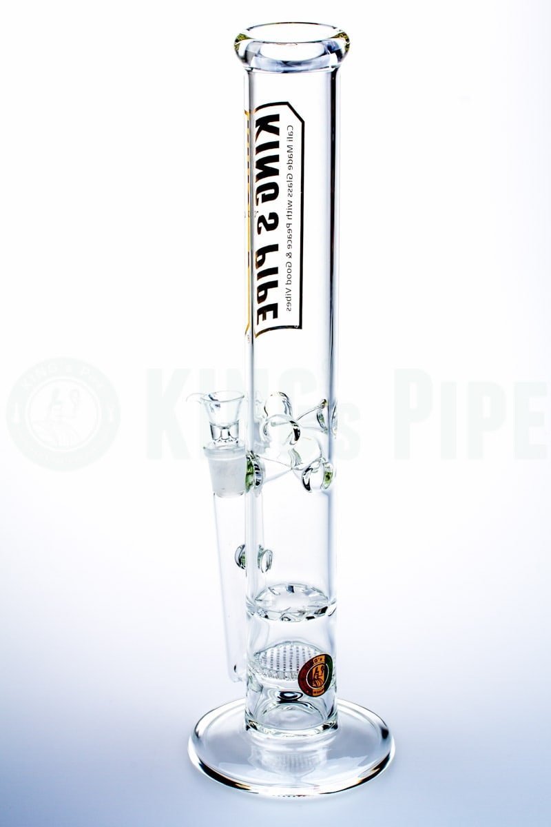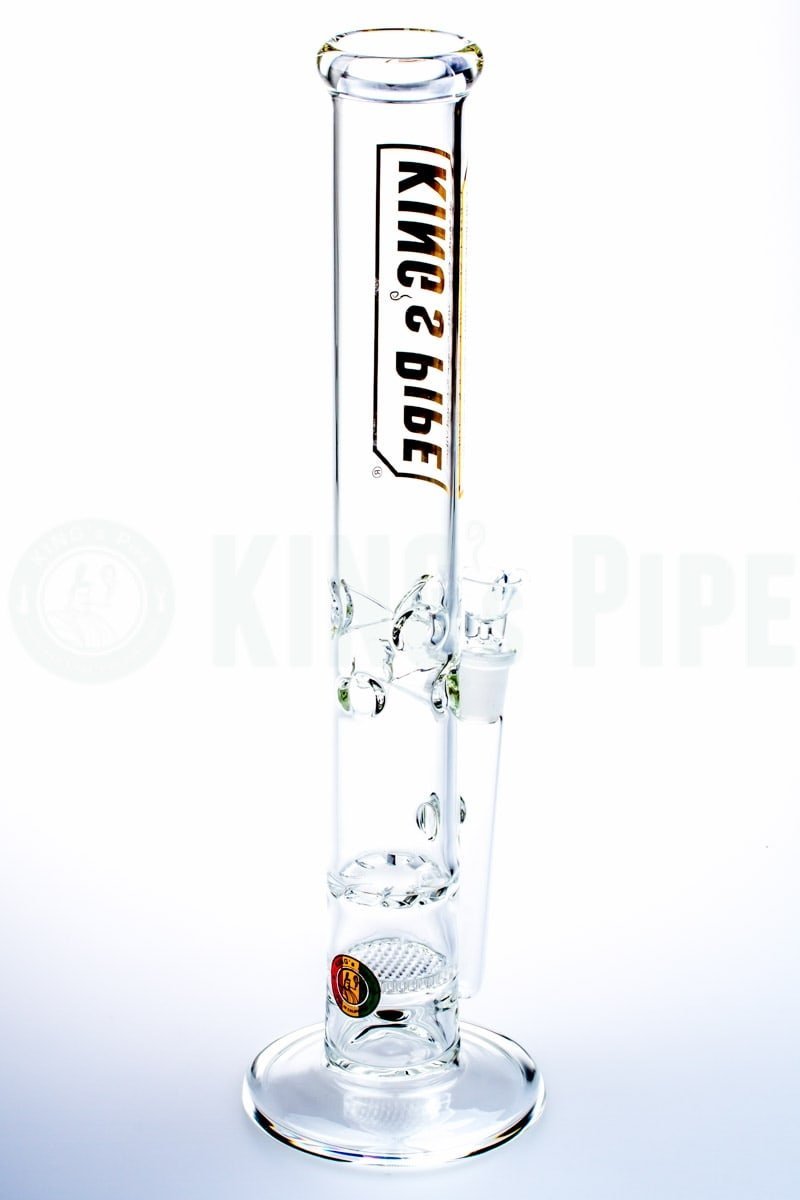 The 16" Honeycomb to Tornado Straight Water Pipe is one of KING's Pipe's most popular items. With double the percolating power, this scientific glass bong is built with a honeycomb disc perc that pushes smoke into a tornado cyclone turbine disc perc for extra diffusion with a cool ass visual effect too! Also equipped with an ice catcher, 18mm Female joint & bowl, this big bad American glass water pipe is proven sturdy & heat resistant having been handcrafted by 5mm thick, Borosilicate glass right here in beautiful California. Sure to last you & your buddies hella years of smokey goodness!