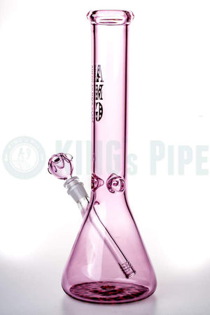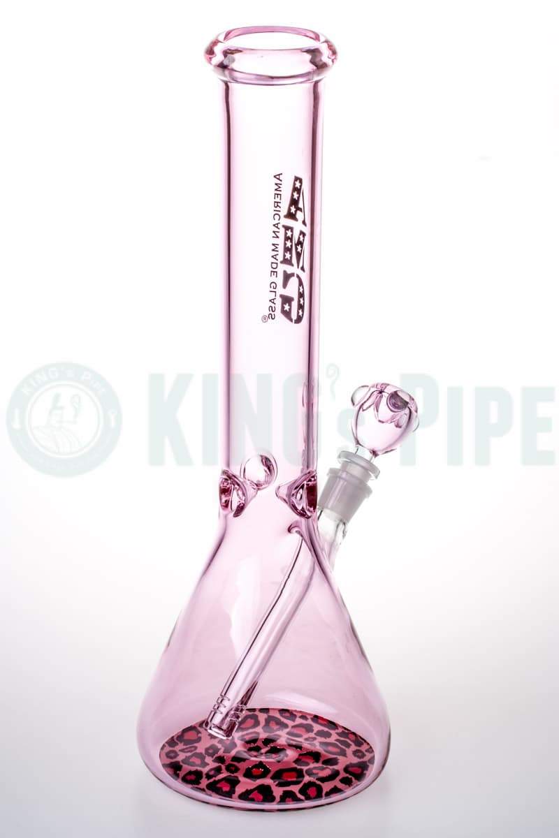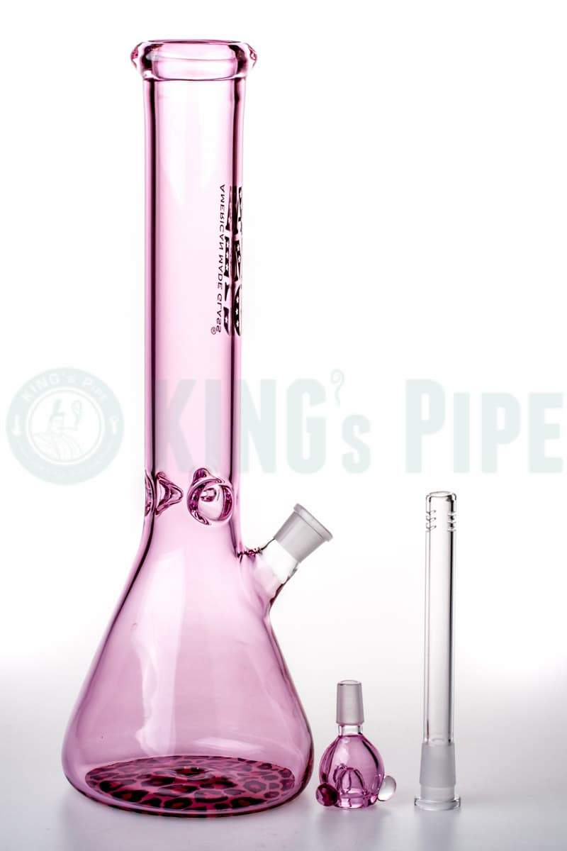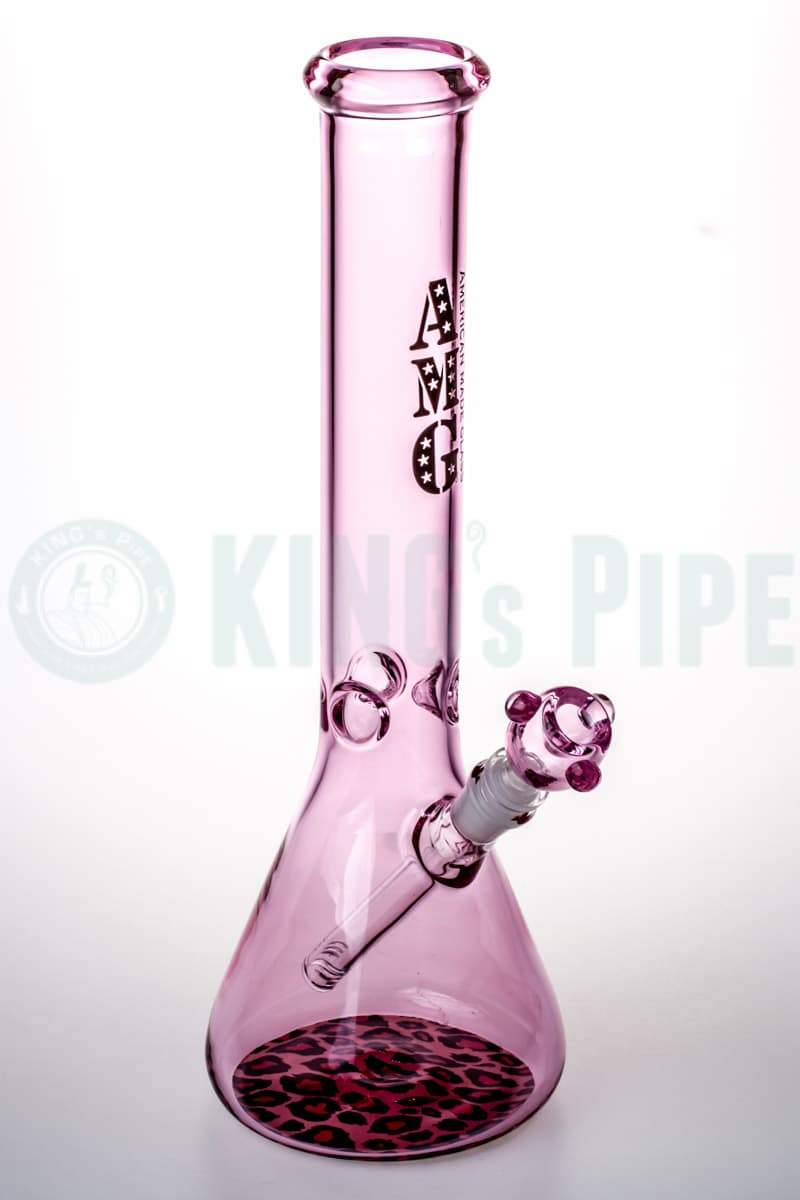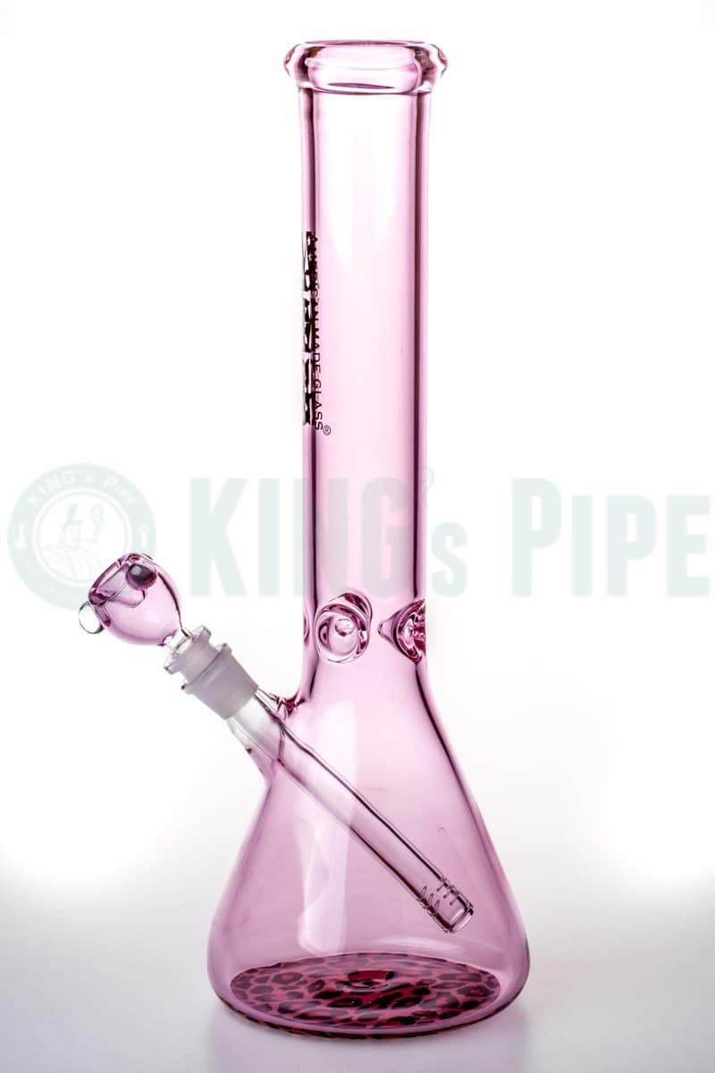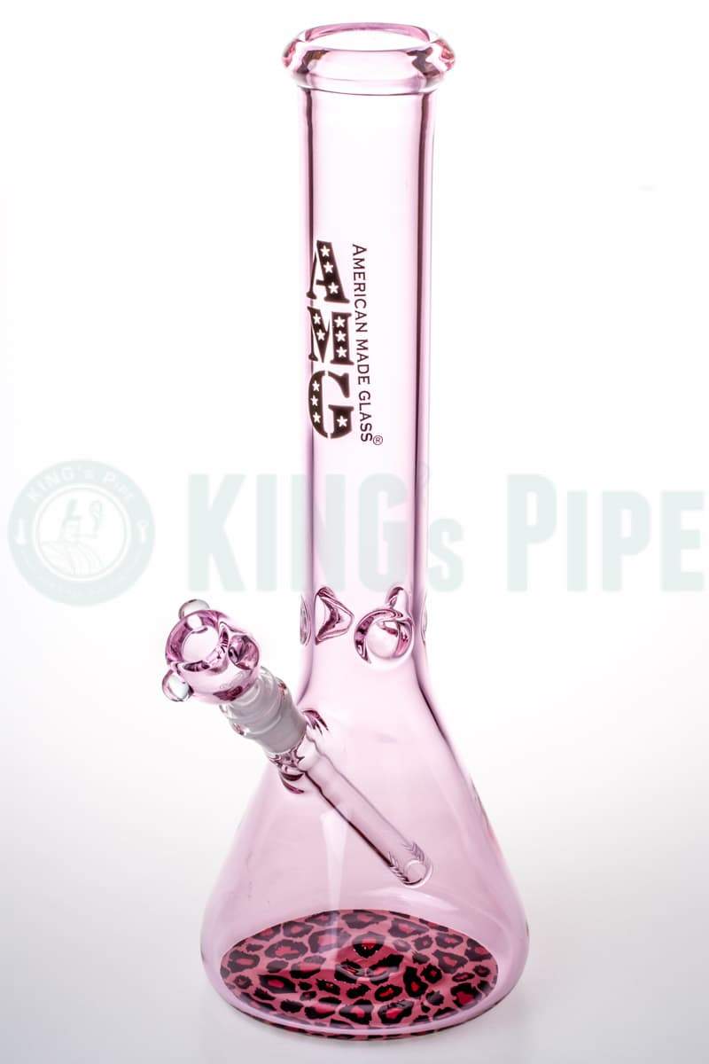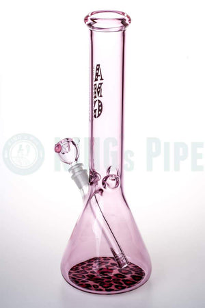 Show people your sexy, sassy side with the AMG 15" Pink Leopard Beaker Water Pipe. Manufactured by American Made Glass, this scientific pink bong consists of a 14mm/18mm Low Profile Diffused Downstem, 14mm Male Glass Bowl and an Ice Catcher. This American Glass water pipe stands proud with its Leopard Graphic Base Design. The Pink Beaker Bong is a must-have for toking girls and girlfriends!