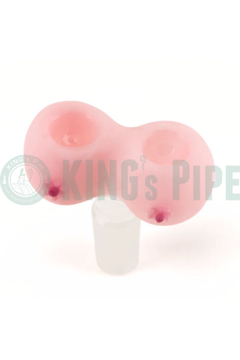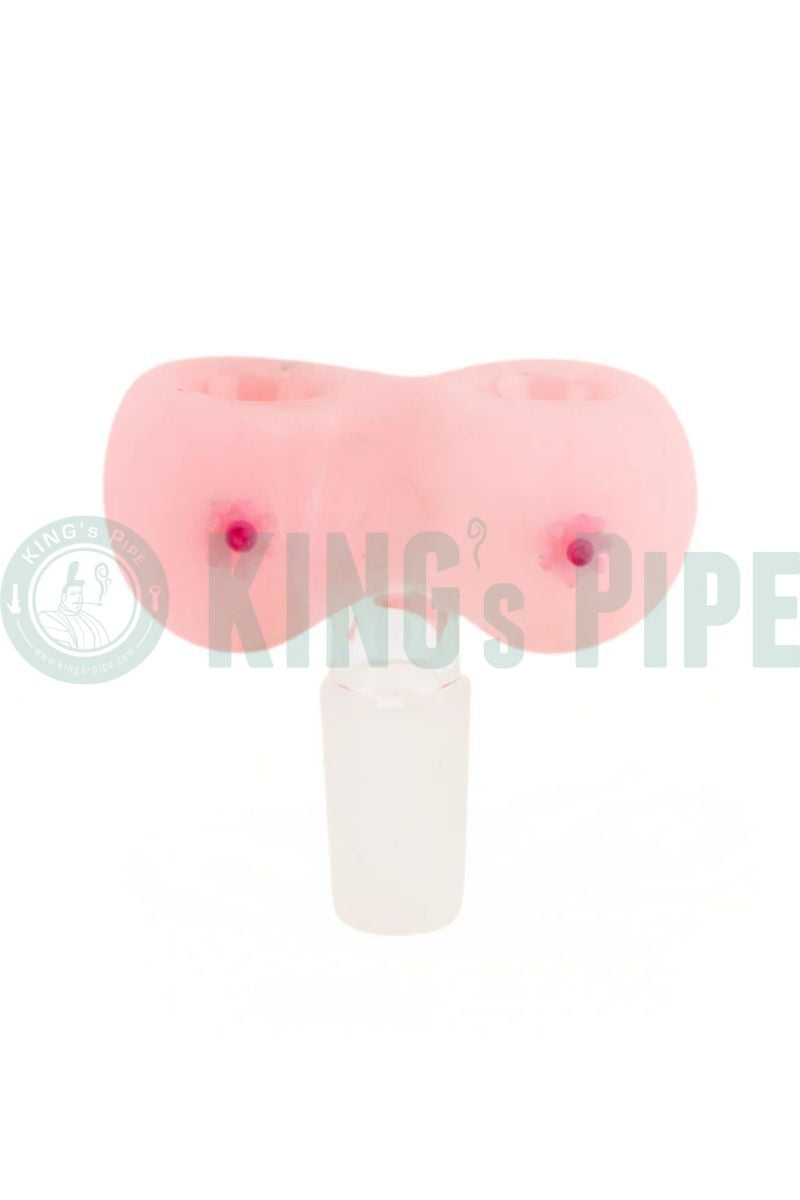Spice up your smoking routine with Empire Glassworks' 14mm Boobies Glass Bowl. This unique piece features a pink "boobies" design and dual holes for an effortless draw. The 14mm male joint ensures compatibility with a variety of pieces. Say goodbye to boring bowls and hello to playful sessions!